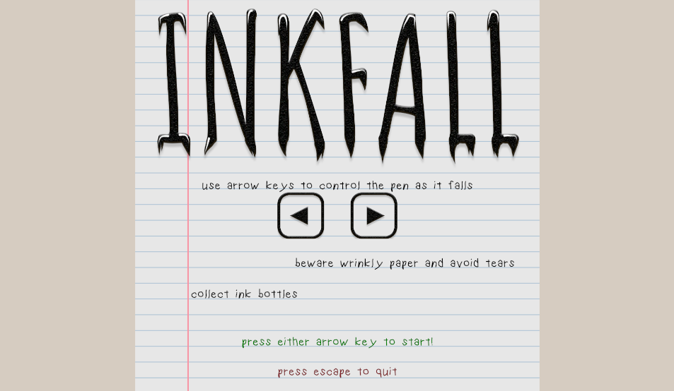 Dead-simple game where you control a falling pen. Dodge tears, replenish ink, reach a high score! To play the game, just extract the zip contents into a folder and run InkFall.exe